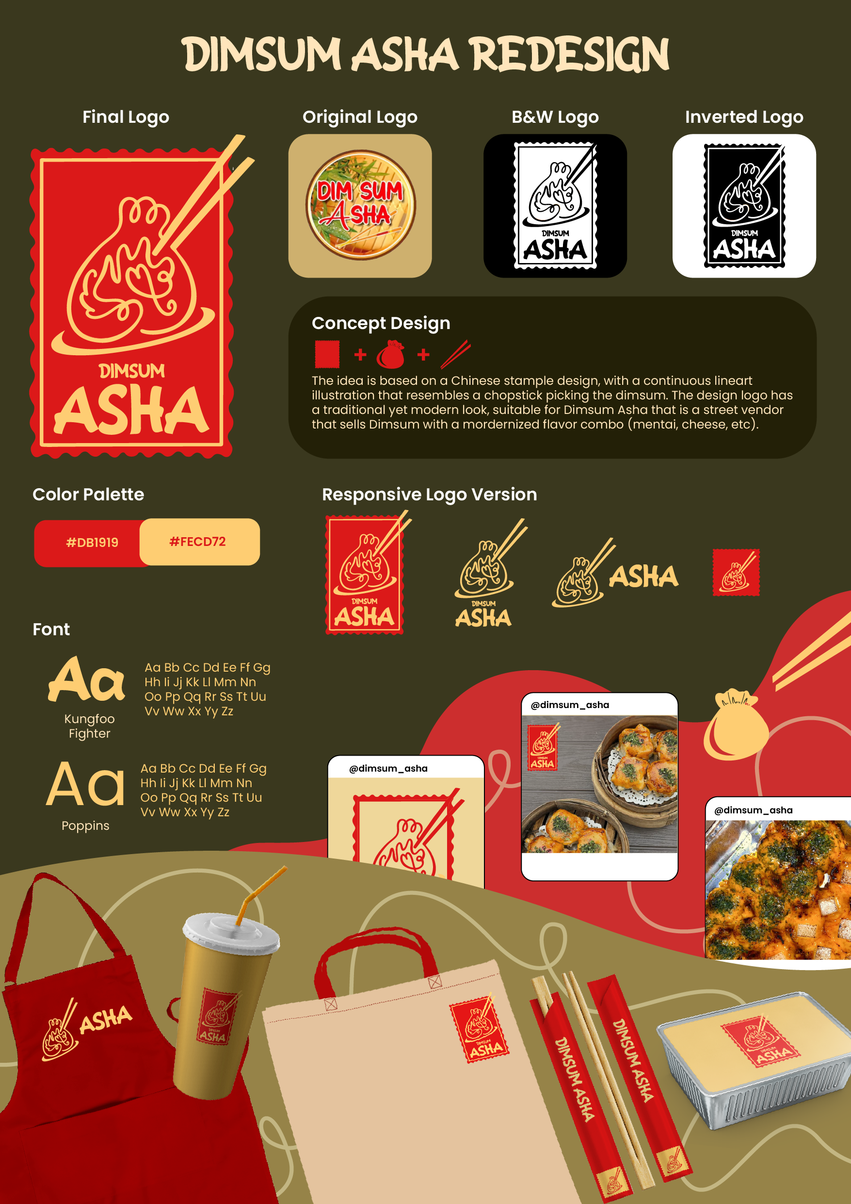 The idea is based on a Chinese stample design, with a continuous lineart illustration that resembles a chopstick picking the dimsum. The design logo has a traditional yet modern look, suitable for Dimsum Asha that is a street vendor that sells Dimsum with a mordernized flavor combo (mentai, cheese, etc).
