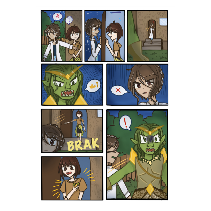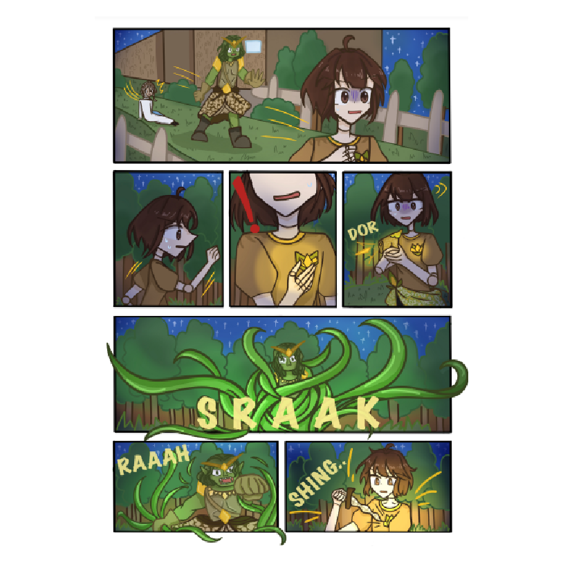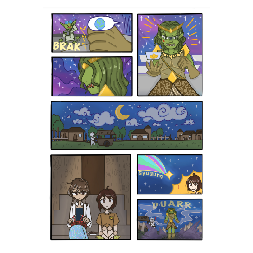 Short Comic adaptation from the Indonesian folklore “Timun Mas.” I modernized the storyline where Buto Ijo becomes an alien with his assistant Babu, and Timun Mas is actually a living marionette created by a scientist mother. The art style blends anime and cartoon elements.